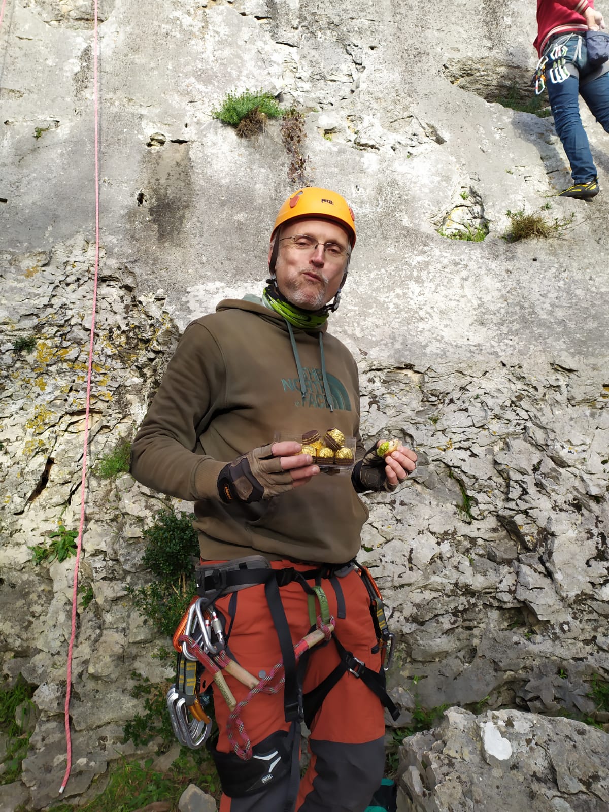 Petit à petit nous nous sommes réchauffés et la falaise un tout petit peu aussi, à grands renforts de thé chaud du thermos de Nico. Et d’une boîte de rochers Ferrero de Sergi.